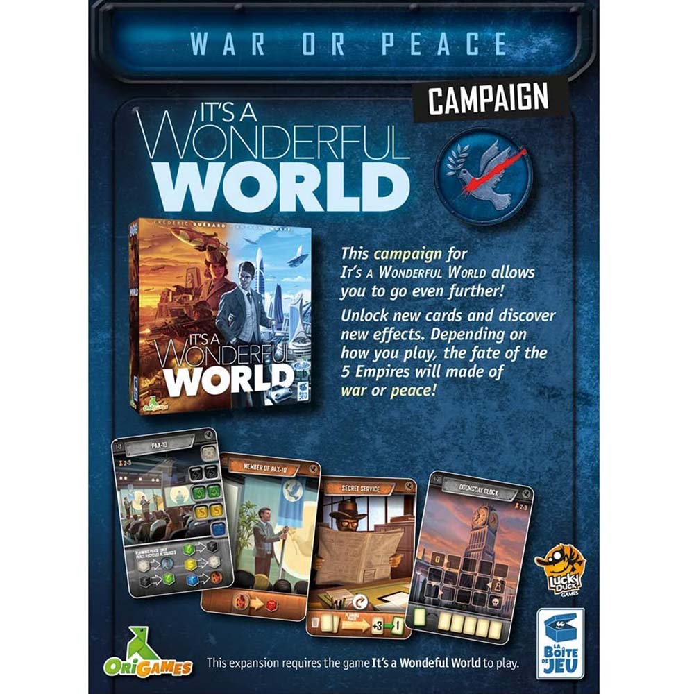 This expansion is a campaign allowing players to live an adventure scripted in 5 scenarios which brings, collectively during the game, players to make choices that will tip the story towards Peace or World War.