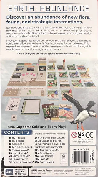 Earth:Abundance expands the award-winning board game Earth with new mechanics, player interactions, and an increased 1-6 player count. Acquire new “seed” resources, and cultivate them into sprouts, soil growth or compost. Germinate seeds to curate your hand, searching the Earth pile to find cards that suit your strategy and scoring objectives. New events generate resources for you, and other players, and certain cards even allow you to benefit from your neighbor’s tableaus. This expansion deepens the roots of the base game while introducing rich new interactions and strategic opportunities.