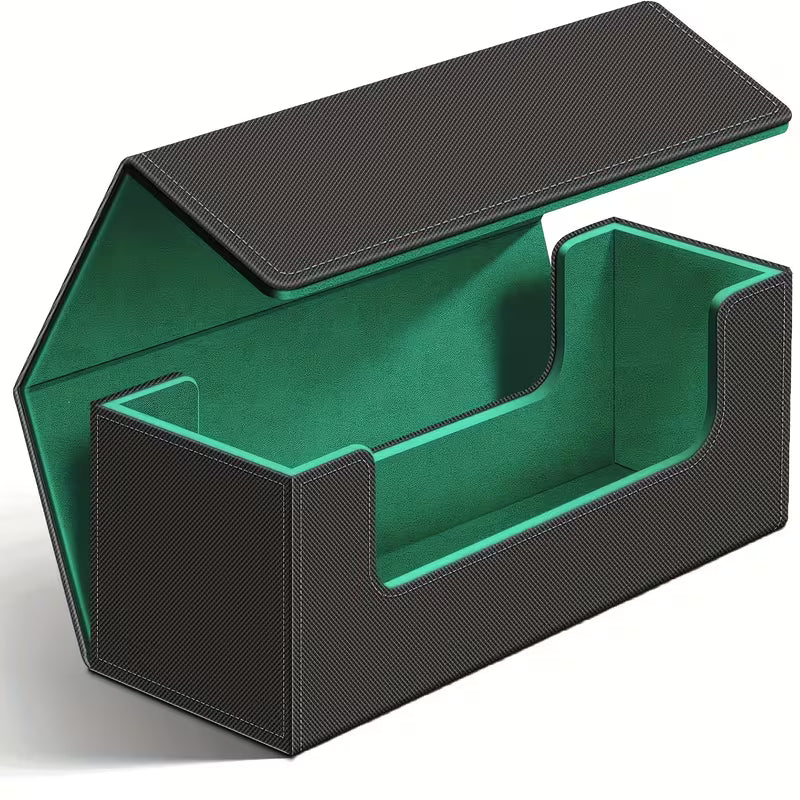 Horizontal Card Storage Box with Magnetic Flip Cover that can hold slab/graded cards as well as standard sized cards for Pokemon, One Piece and Magic: The Gathering.