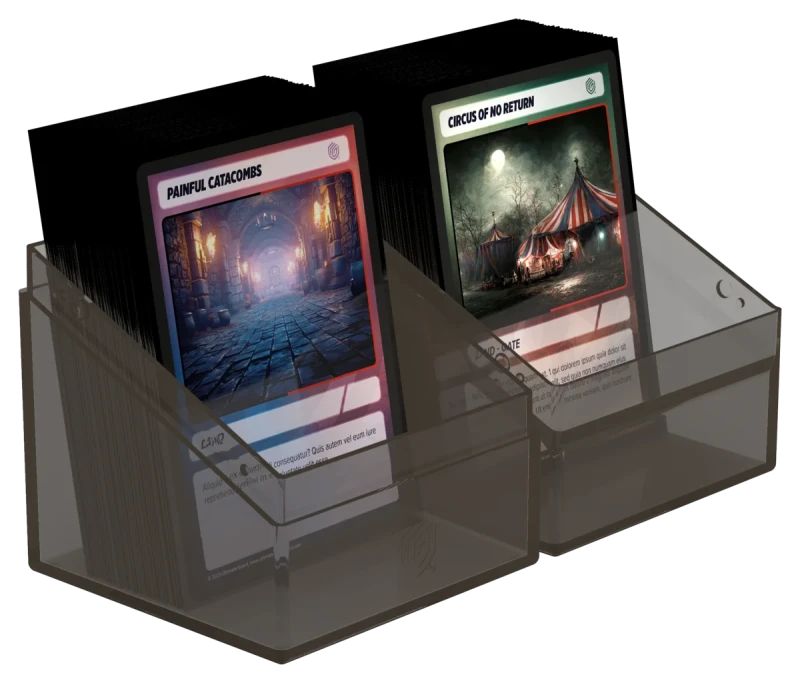 Ultimate Guard Boulder 100+ Clear Deck Boxes The legend is back in an all-new look: with the transparent Boulder 100+ Clear, you'll always know exactly which cards are in your deck box. The Boulder 100+ Clear is a durable and reliable deck box with a secure closure. It can hold up to 100 double-sleeved or 120 single-sleeved cards from all popular trading card games like Magic: The Gathering, Pokémon, Lorcana, One Piece, or Yu-Gi-Oh! • Completely transparent • Secure closure • Durable and rigid box • Modular design to combine with Ultimate Guard products *Cards not included